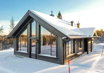 Kompakt hyttemodell med mulighet for mange løsningsvalg. Basismodellen inneholder to soverom, romslig bad, bod/teknisk rom og åpen stue, overbygd inngangsparti, kjøkken/spiseplass med store vinduer som gir mye lys og fantstisk nærhet til naturen.