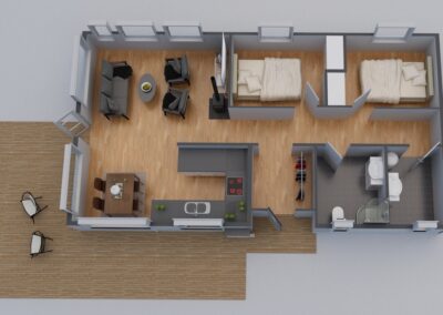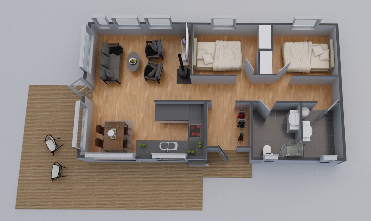 Basismodellen inneholder to soverom, romslig bad, bod/teknisk rom og åpen stue, overbygd inngangsparti, kjøkken/spiseplass med store vinduer som gir mye lys og fantstisk nærhet til naturen.